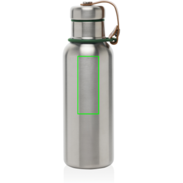 De roestvrijstalen geïsoleerde waterfles is een slanke, vacuümverzegelde fles die drankjes 24 uur koud of 12 uur warm houdt. Ook de deksel is volledig van roestvrij staal, waardoor het water niet in contact komt met plastic. Het kunstleer fungeert als draaglus en is tevens een mooi designdetail.