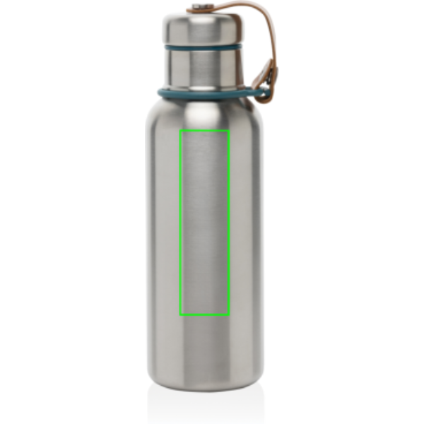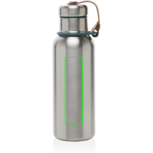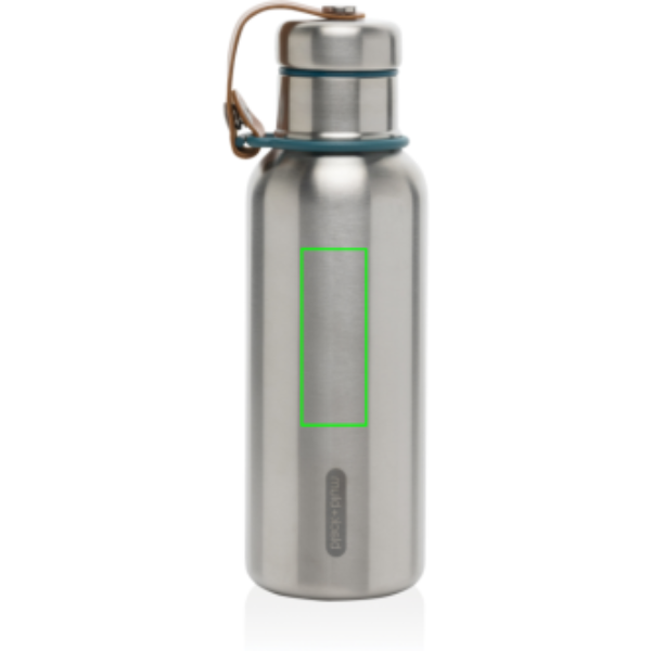 De roestvrijstalen geïsoleerde waterfles is een slanke, vacuümverzegelde fles die drankjes 24 uur koud of 12 uur warm houdt. Ook de deksel is volledig van roestvrij staal, waardoor het water niet in contact komt met plastic. Het kunstleer fungeert als draaglus en is tevens een mooi designdetail.